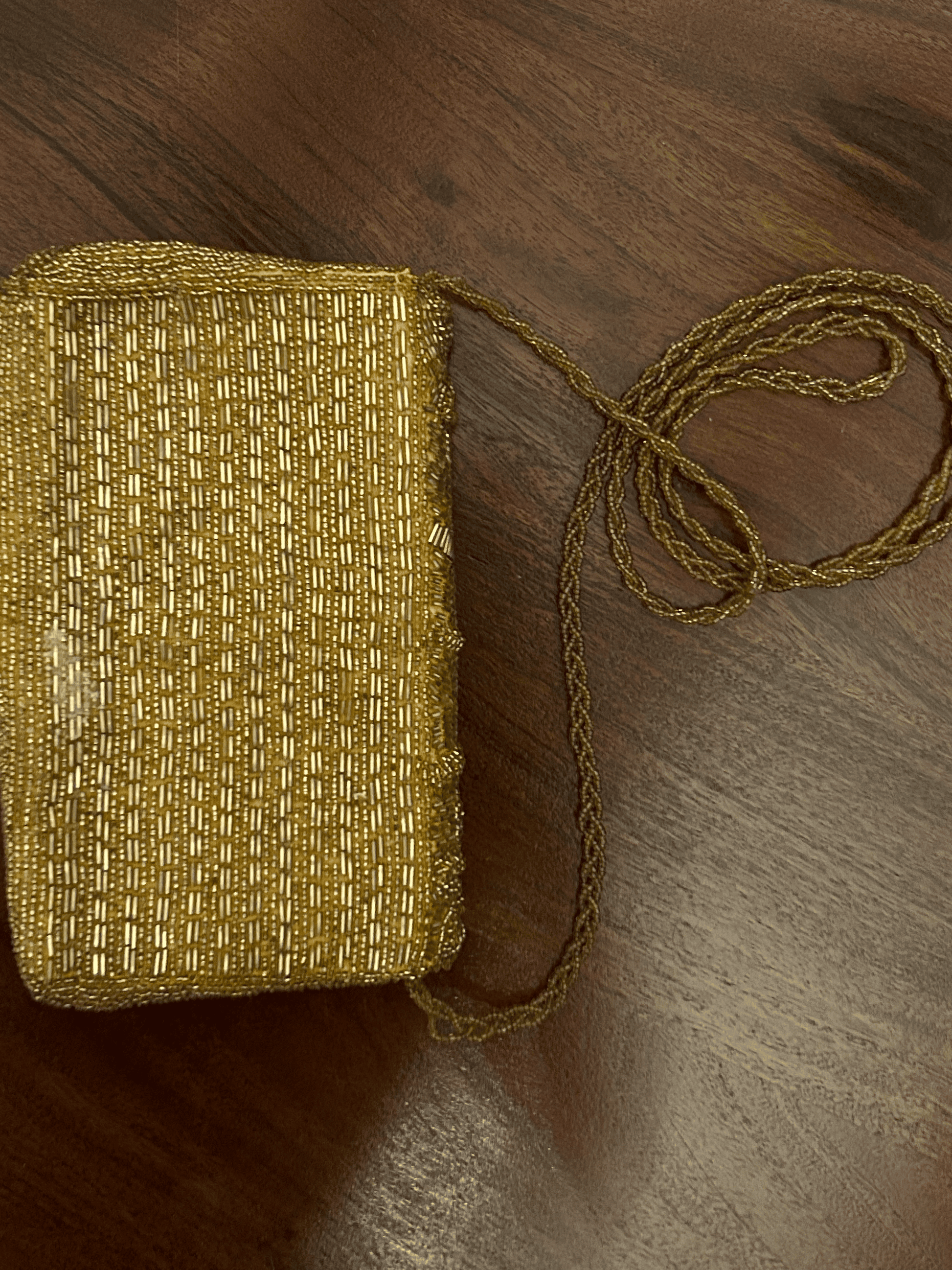 1940s gold beaded minaudière with silver-tone bead accents and intricate craftsmanship. Excellent condition with minor wear at the back. Timeless vintage elegance.