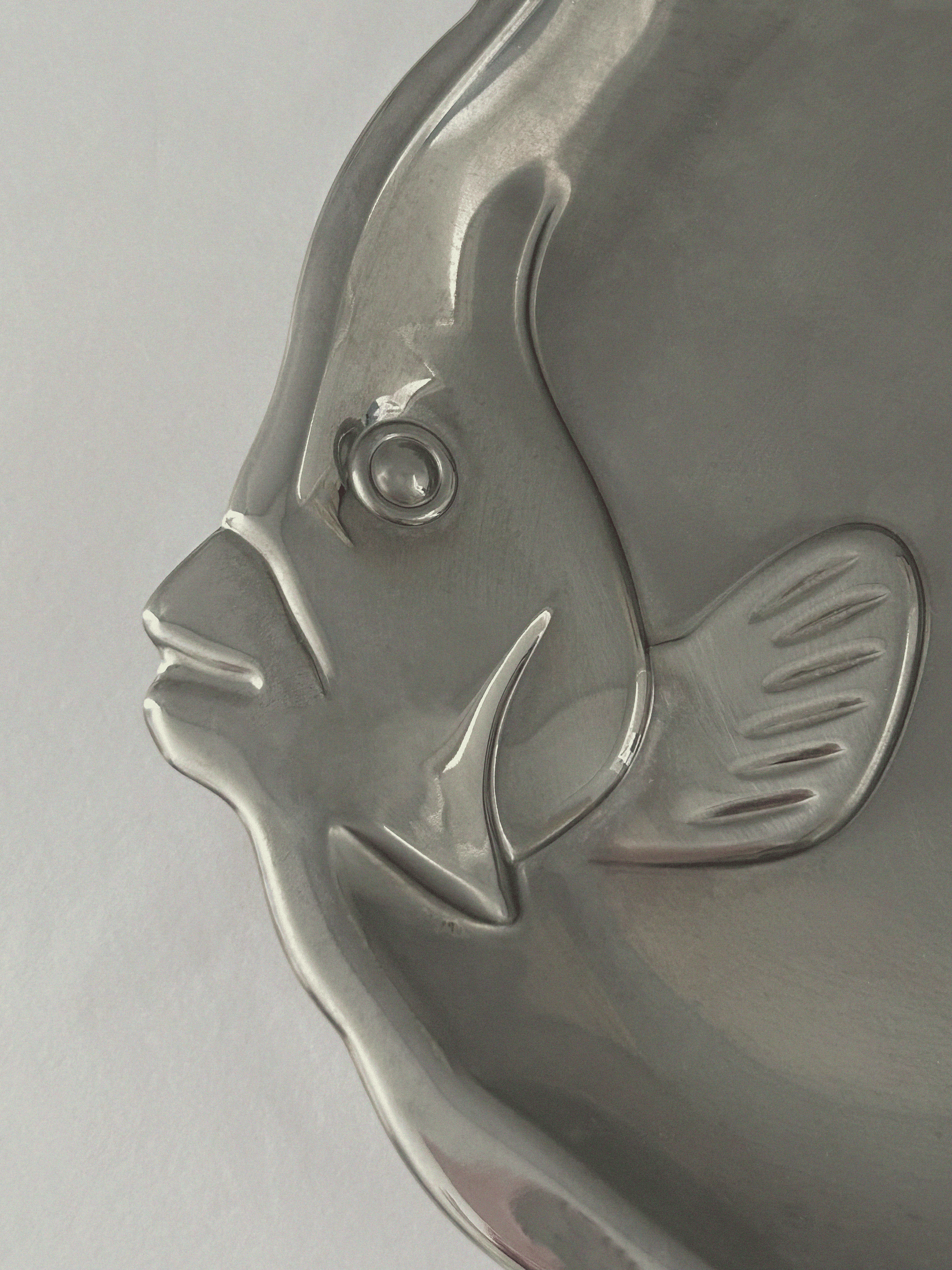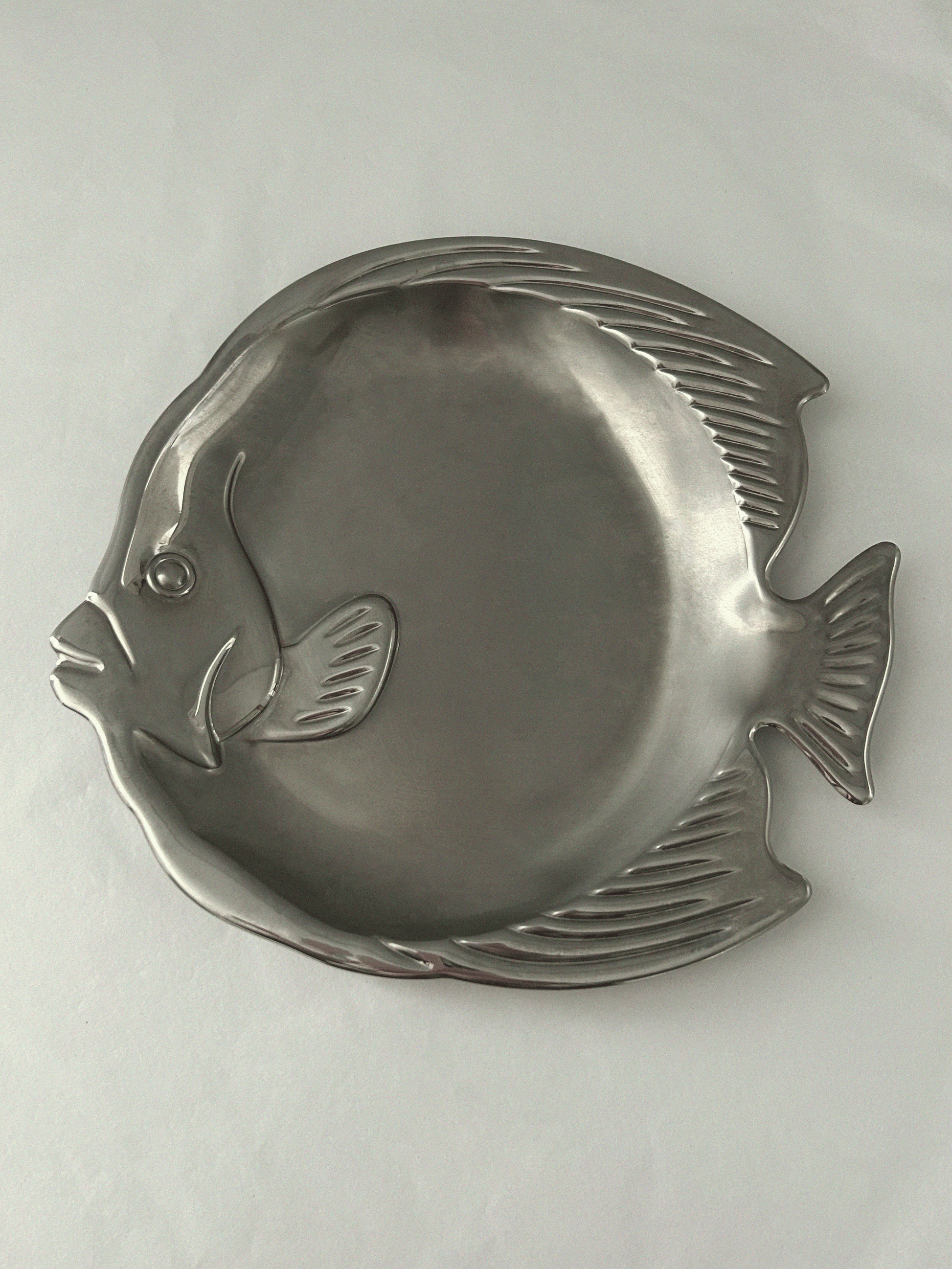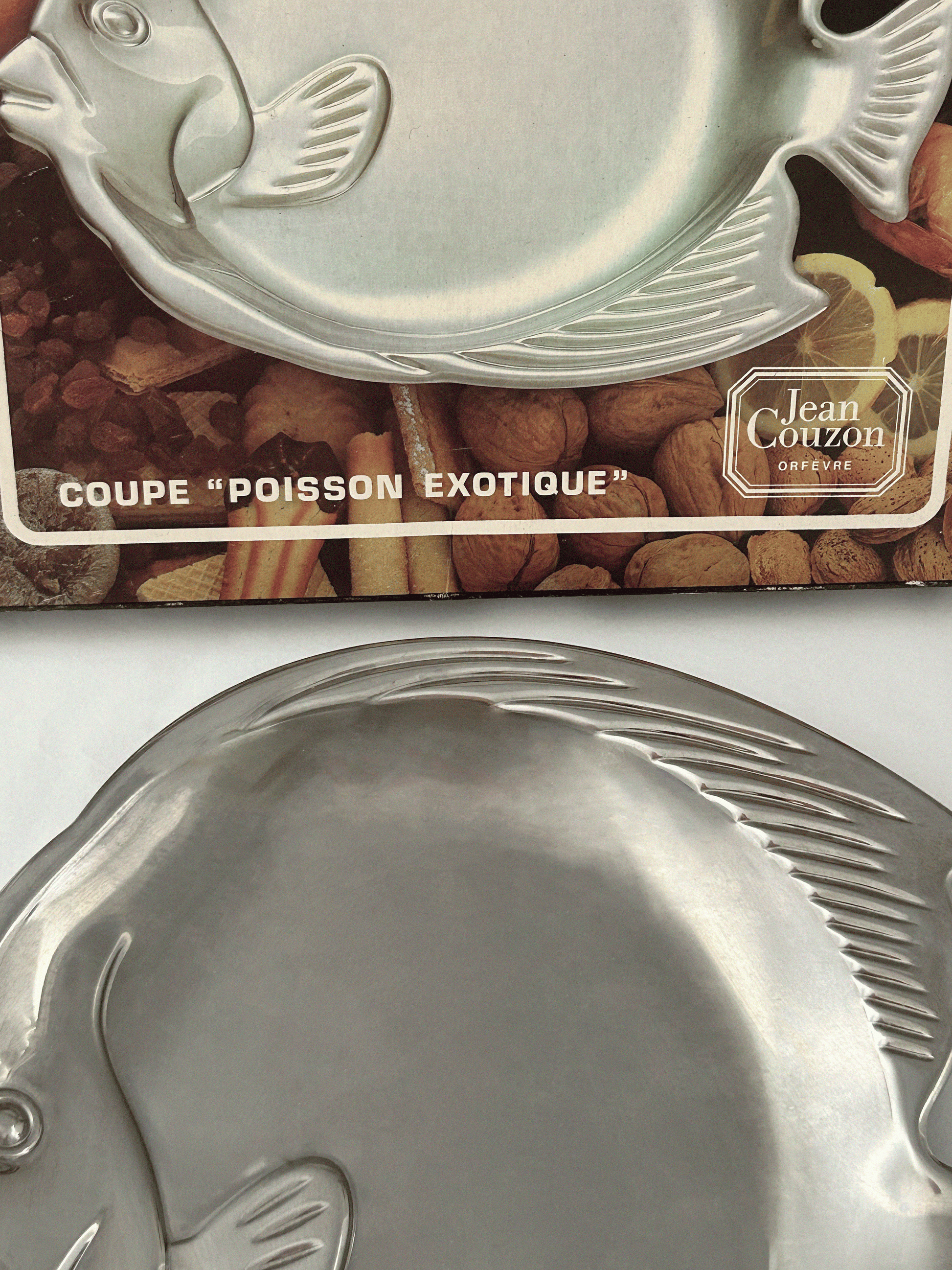 Vintage french designer fish dish. Curated rare antique. Measures at 27 x 25 cm. 10.7 x 10.1 inches. Made from high-quality metal made to last. Unique design provides a functional yet beautiful serving option for your next table scape. Comes with its original vintage box. Made in France by J.C a french silversmith.