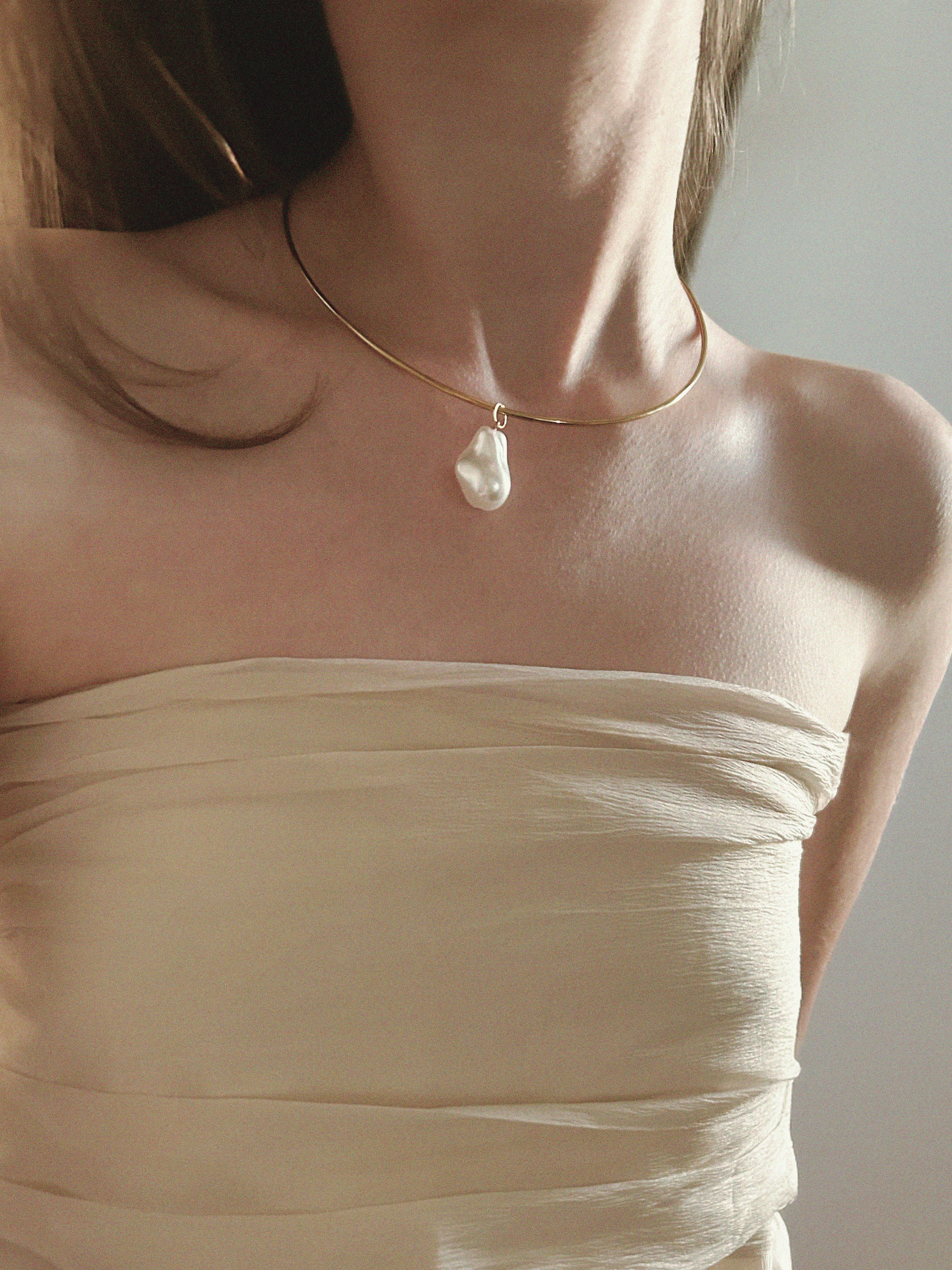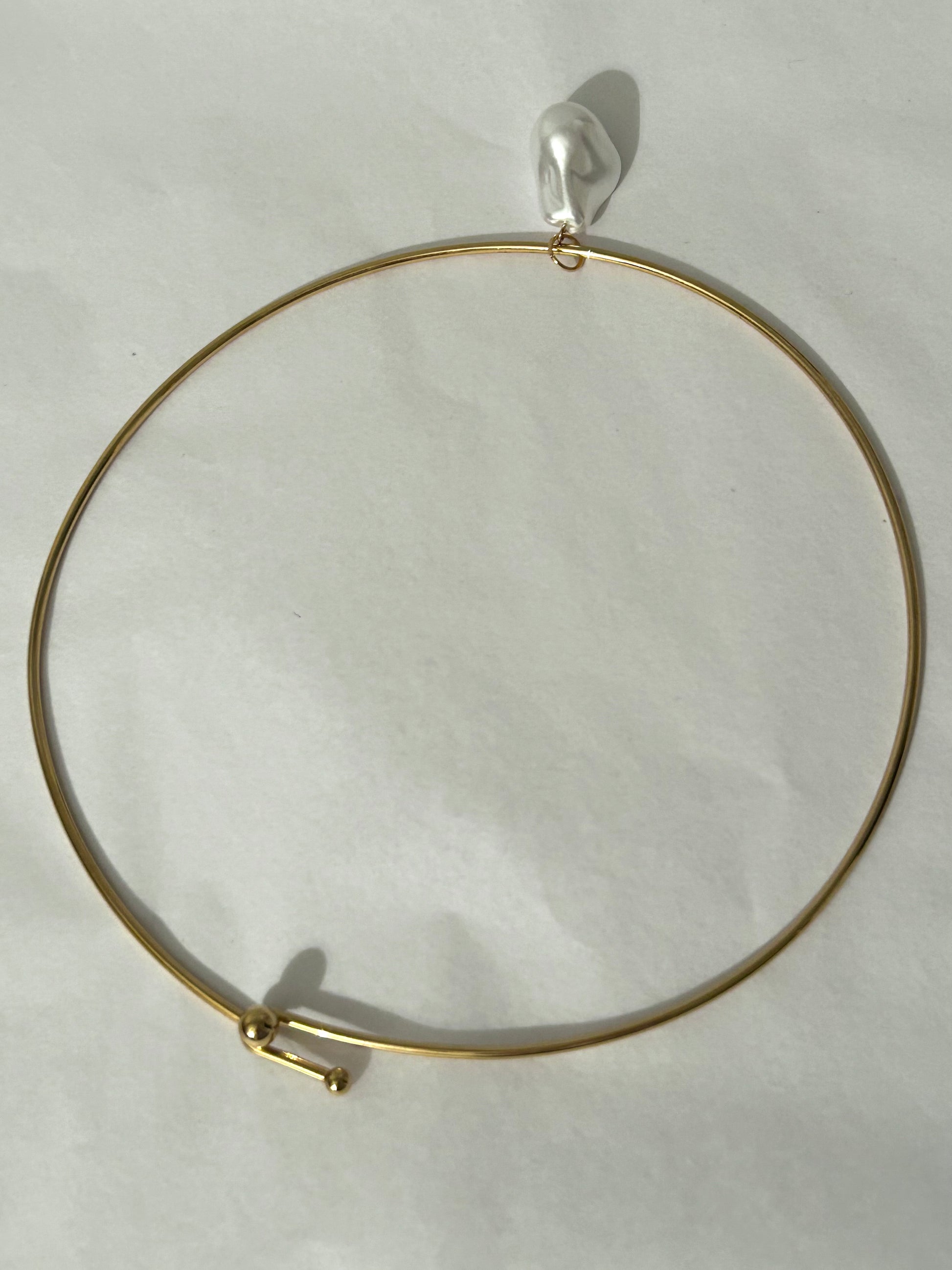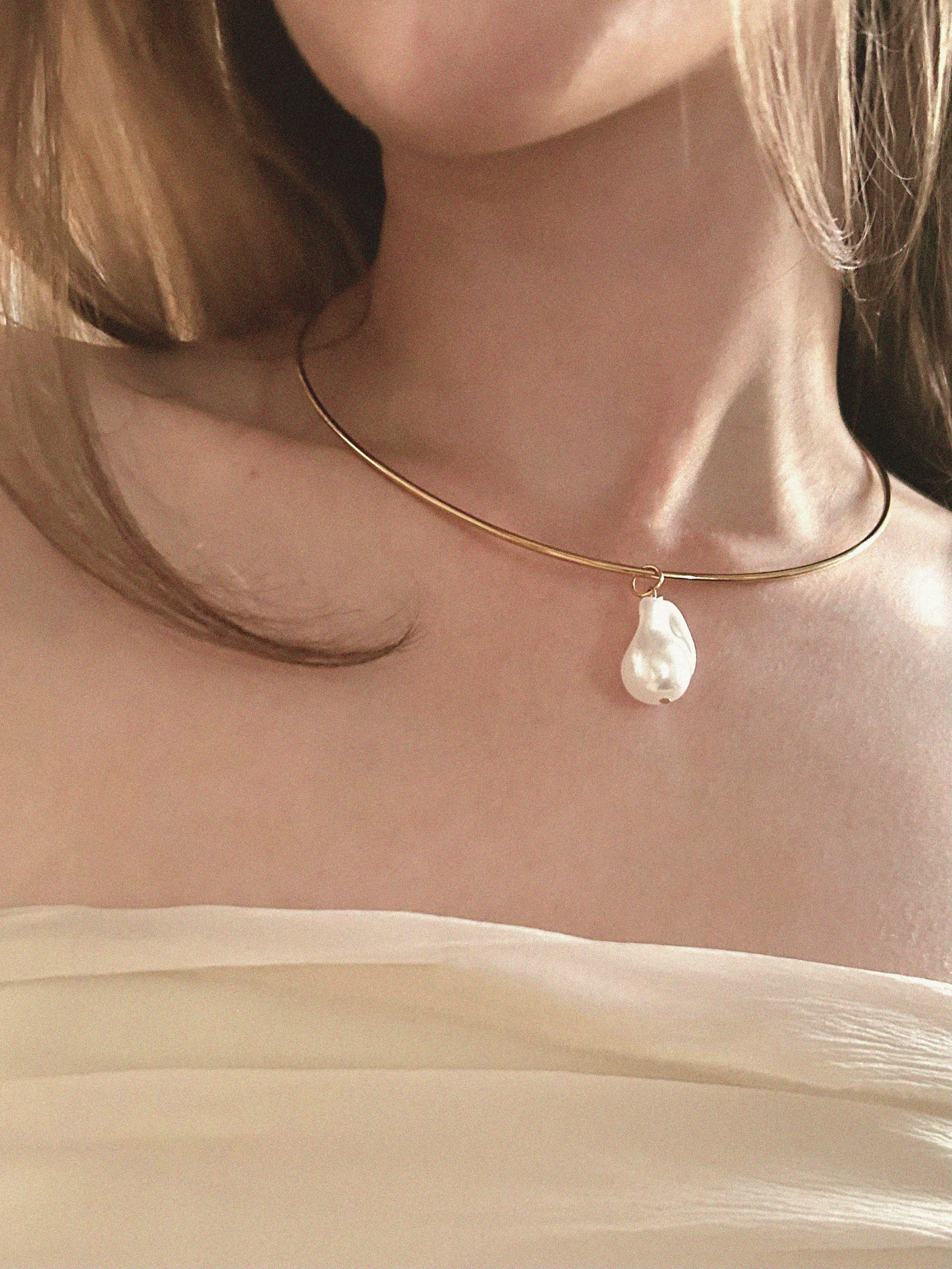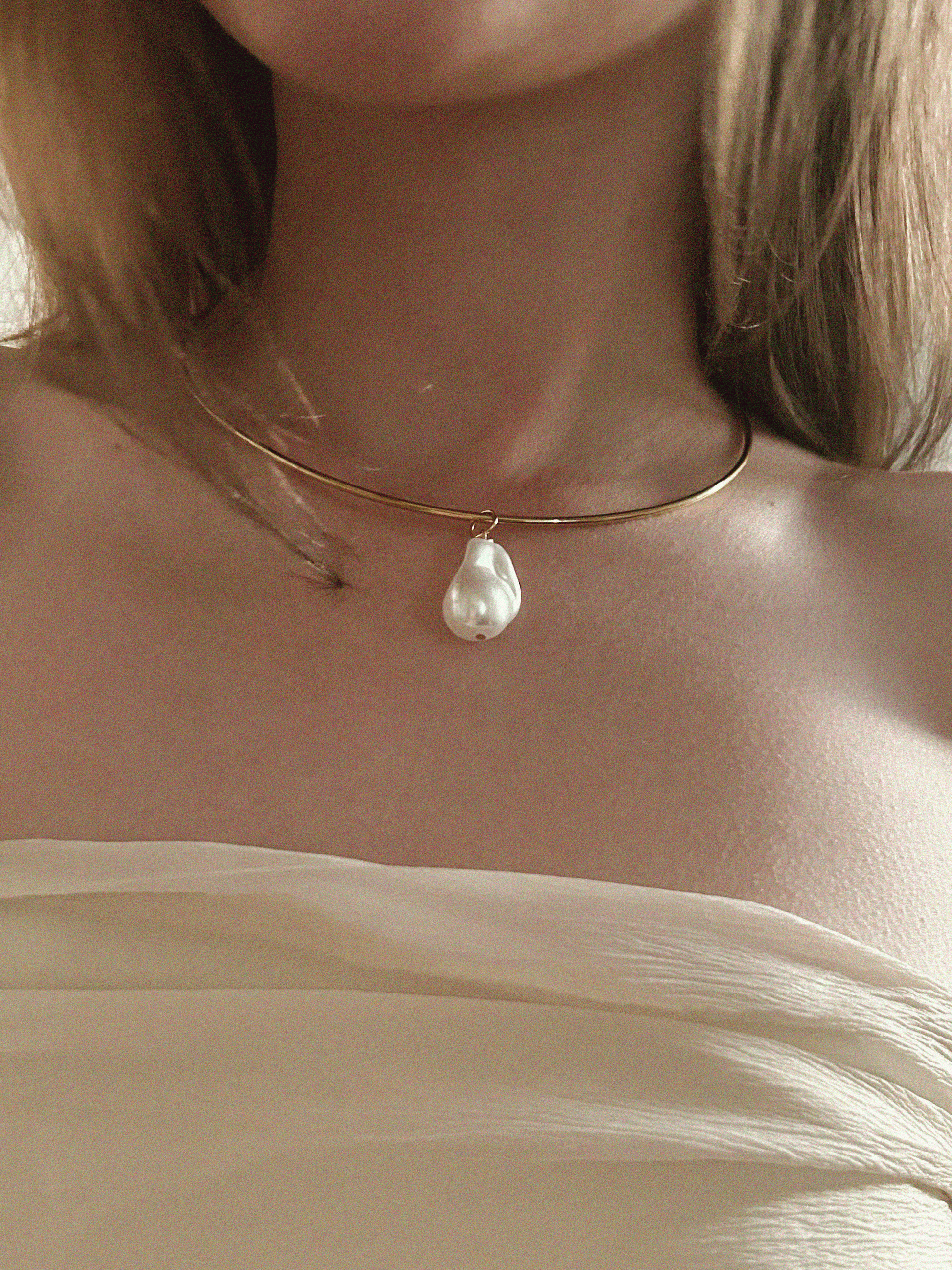Gold choker necklace featuring a baroque pearl. Vintage inspiration from Dolce & Gabbana's SS 2000 fashion show.